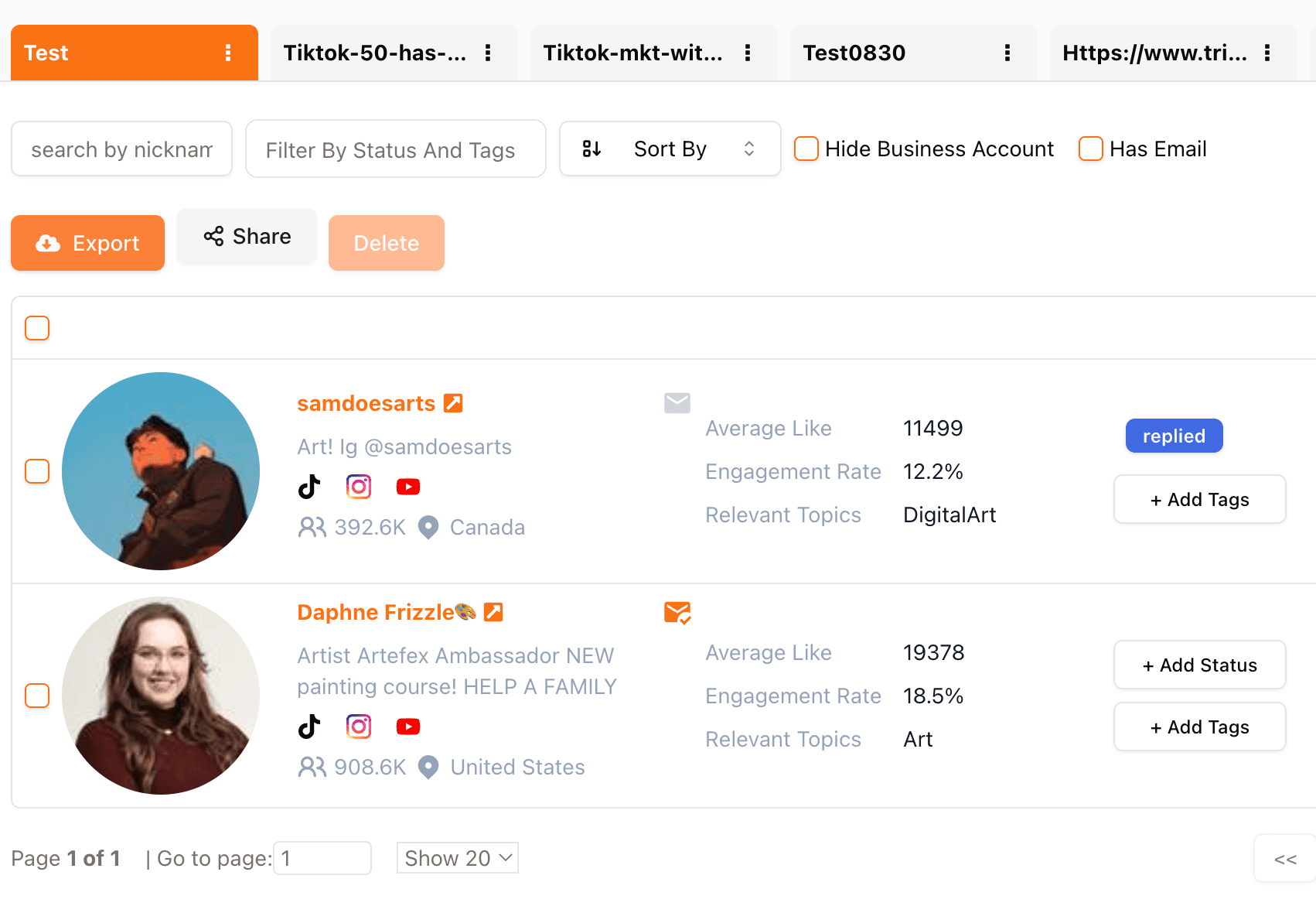Organize influencers into custom lists (e.g., by campaign, niche, or status).